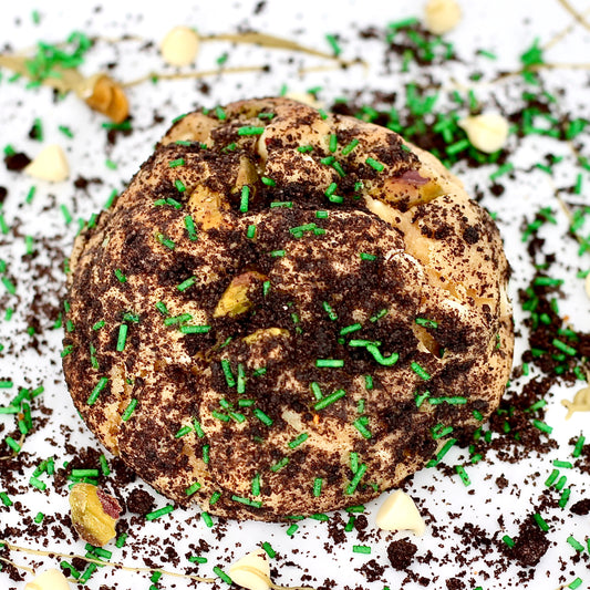 Packed with roasted pistachios, Belgian white chocolate, and a gooey pistachio crème centre. Finished with Oreo crumb for a soft-meets-crunch bite. A luxurious Halloween cookie for true pistachio lovers.